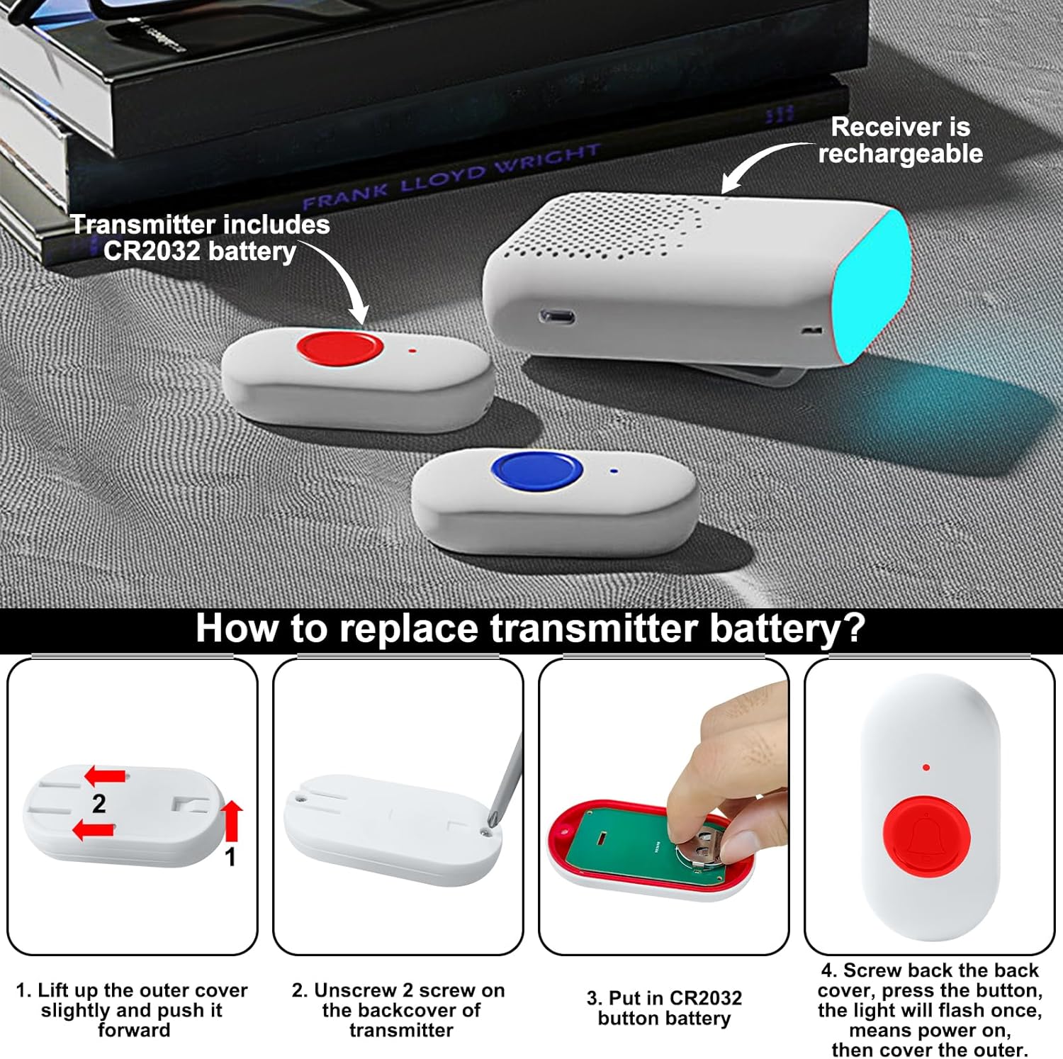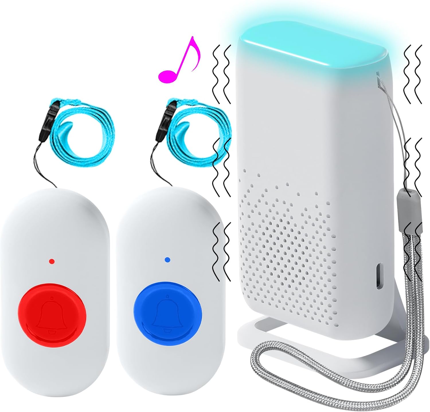 Ideal als Alarm für Menschen, die schnell Hilfe benötigen, wie ältere Menschen, Blinde, Taube, Kinder, Behinderte, Schwangere oder Kranke.Das Kindermädchen oder der Pfleger kann nicht immer bei den Patienten oder Behinderten bleiben, drücken Sie einfach die Ruftaste, um eine rechtzeitige und rücksichtsvolle Betreuung ohne Geschrei zu erhalten.Für Gehörlose oder Menschen, die den Klingelton nicht hören wollen, kann der Vibrations- und Blinkmodus sehr hilfreich sein.Es kann auch als Türklingel verwendet werden.Bis zu 200-300 Meter Reichweite im offenen Bereich (Wände und andere Objekte reduzieren die Reichweite).Der Empfänger ist tragbar, Sie können ihn überall hin mitnehmen, indem Sie ihn in der Tasche aufbewahren oder ihn mit dem mitgelieferten Gürtelclip befestigen. Mit der mitgelieferten Halterung können Sie ihn auch auf den Tisch stellen.Der Sender ist mit einem wasserdichten Ring ausgestattet und kann um den Hals gehängt oder in die Tasche gesteckt werden.