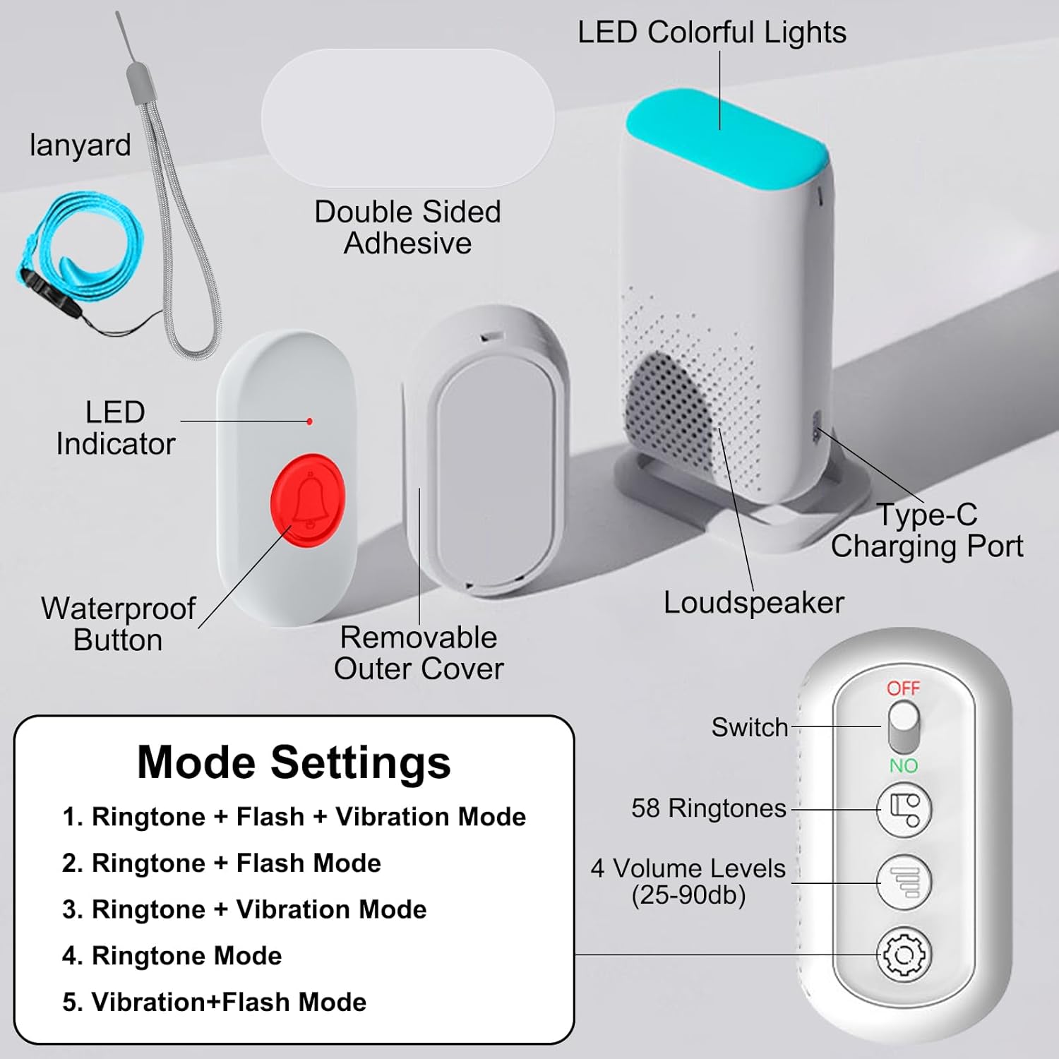 【58 Melodien & 4 Lautstärkestufen & 5 Modi】Wireless home alarm system with 1 Call button and 1 Portable Vibration Receiver. Es gibt 58 Melodien, 4 Lautstärkestufen (von 25dB-90dB) und 5 Arbeitsmodi, Sie können den Vibrations- + Blitzmodus in der Nacht verwenden, so dass Sie andere nicht durch zu laute Klingeltöne stören werden. Verschiedene Kombinationsmodi erfüllen die täglichen Bedürfnisse.