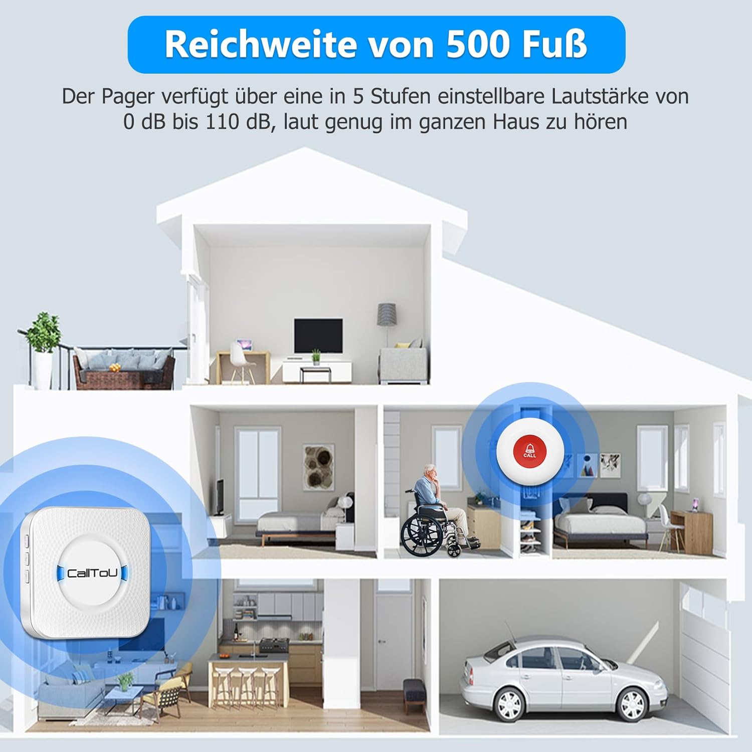 [Leicht zu tragen] Der Empfänger plug-and-play und der Arbeitsbereich im offenen Bereich beträgt mehr als 500 Fuß. Sie können ihn ins Schlafzimmer, in die Küche.Notrufknopf kann auch mit einem Halsband wie ein Anhänger um den Hals der Person gehängt werden, die Hilfe benötigt, oder mit einer Halterung oder einem Doppelaufkleber befestigt werden