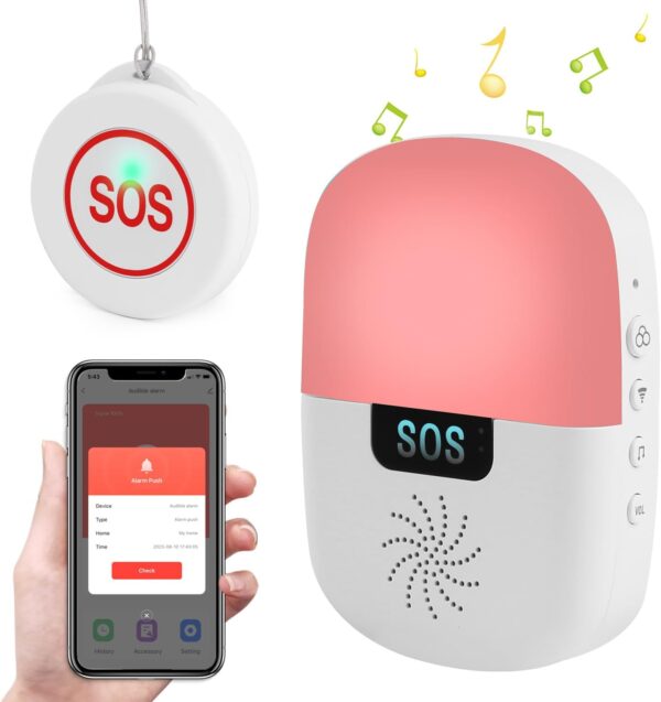 Akustisches und visuelles Dual-Alarm-Design, stellen Sie sicher, dass die Pflegeperson den Alarm erhält und Ihre Lieben sich sicher fühlen. Das Notfallalarmsystem bietet eine Auswahl von 8 verschiedenen Klingeltönen und ermöglicht die Einstellung der Lautstärke von 0 dB bis 90 dB. Eine Option für den stillen Modus ist verfügbar, begleitet von blinkenden LEDs.